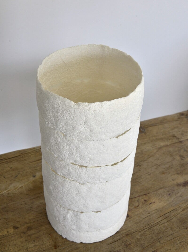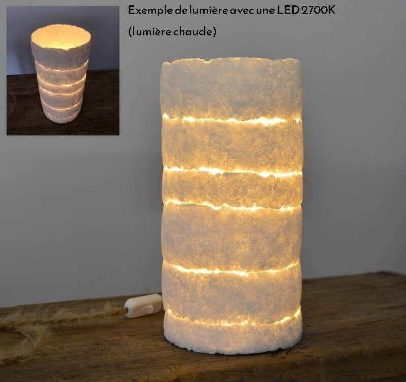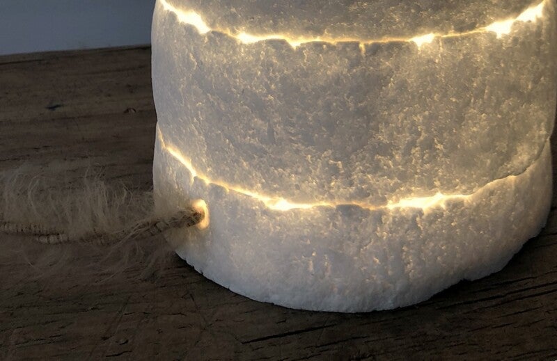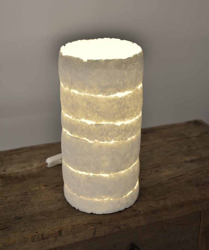 Cette lampe en pâte de papier de forme longiligne est une superposition de plusieurs pièces qui permet de laisser passer la lumière comme des failles dans la terre. Elles est tapissée à l'intérieur d'un papier momigami (papier à texture froissée) qui diffuse la lumière de manière homogène.